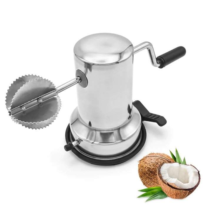 The Coconut Grater makes fresh, moist coconut from fresh coconuts . This is a perfect kitchen utensil for making fresh coconut recipes. It is a table mount model that clamps to any flat work surface. You can grate one coconut in less than five minutes.
